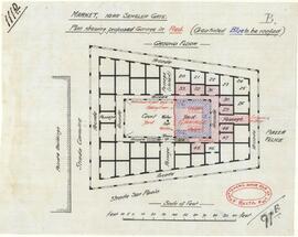 Plan of market near Senglea gate, showing proposed garage in red and the area to be roof tinted in blue.