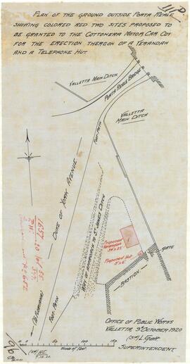 Plan of the ground outside Porta Reale showing colored in red two sites proposed to be granted to the cottoner motor car company for the erecion thereon of a verandah and a telephone hut.