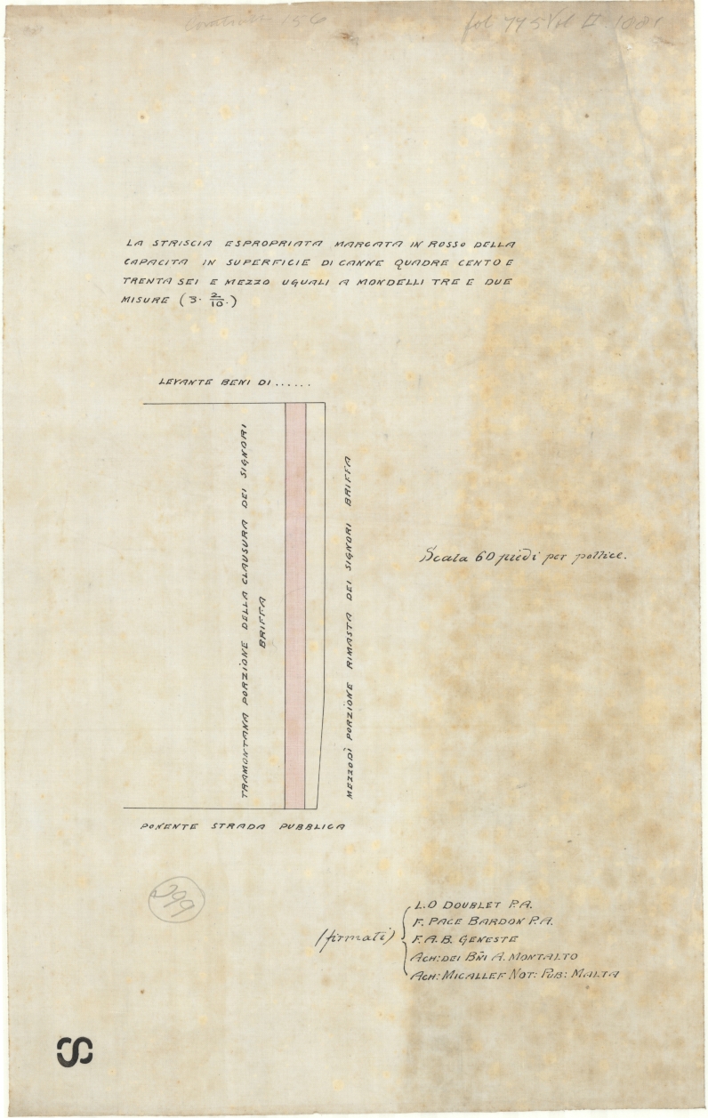 Plan of the land expropriated from Messrs Briffa, marked in red being around 136 squared canne equal to 3 2-10 mondelli (ca .77 tomniet- .