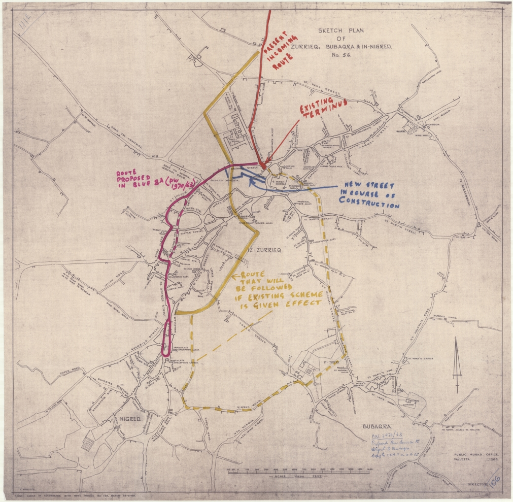 Plan of Zurrieq, Bubaqra and in-Nigred showin in red the present incoming route, in purple the proposed route, in blue the new street in course of construction and in yellow the route that would be followed if the proposed scheme were enacted.