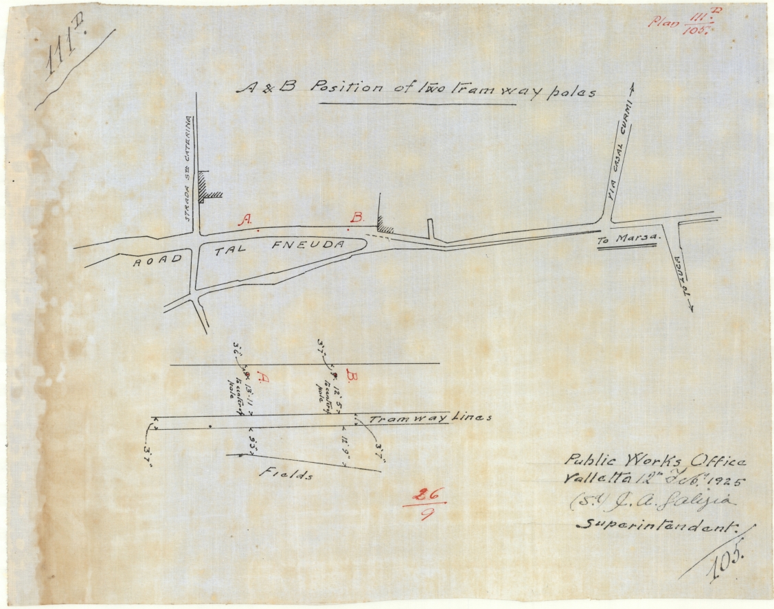 Plan showing A * B position of two tramway poles on the road from Casal Zebbug to Marsa