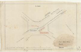 Plan showing in red the proposed new position of Fleur De Lis archway, new traffic island proposed and in blue the pipline to replace existing aqueduct.