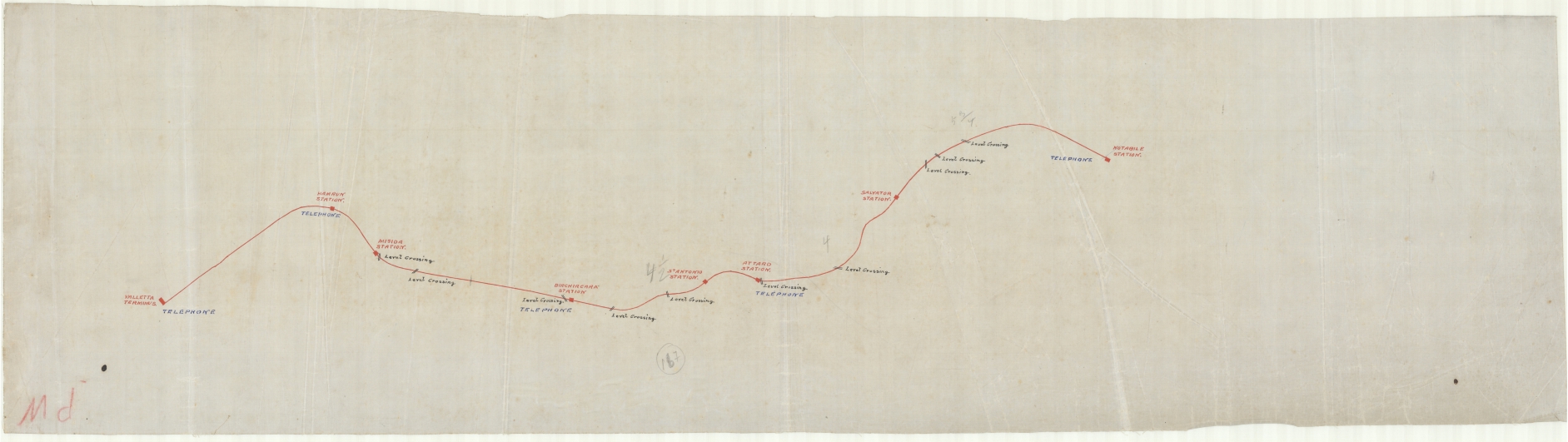 Plan showing in red the train line from Valletta terminus to Notabile terminus, also showing in black, level crossings and in blue telephones.