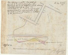 Plan showing in yellow two plost of groung to be dismembered from the property of Mensa Filippina situated at B cara measuring collectively sq canes 33, valued at £5; and in red two plots of around equal area dna value to the two plots in yellow to be given in exchange by the Government.
