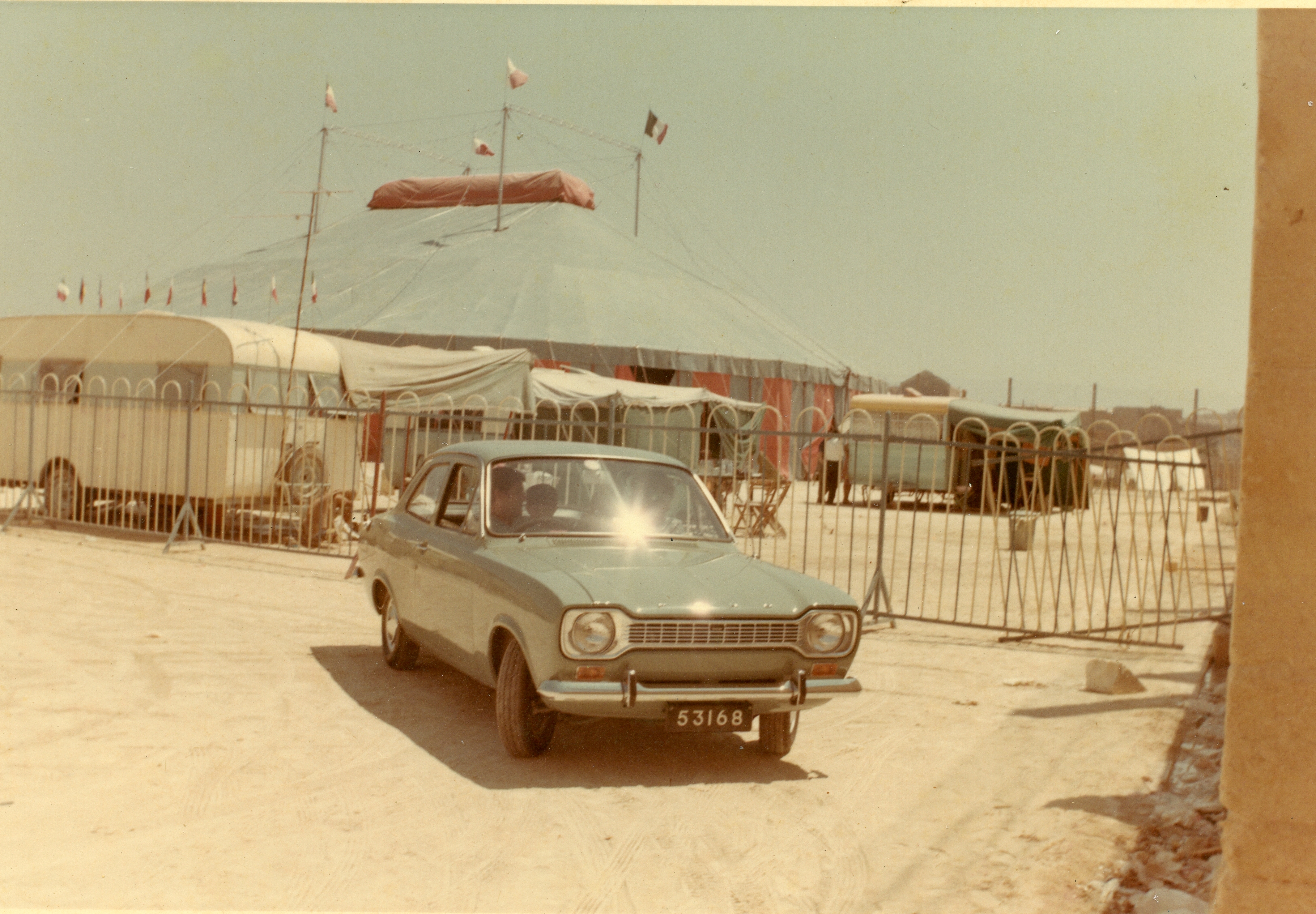 A Ford motor car (number 53168) parked outside a circus "big top"