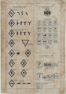 Sheet showing danger warning traffic signs, regulatory traffic signs and informative signs.