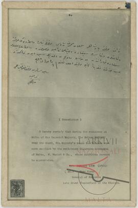 I hereby certify that during the residence at Malta of His Imperial Majesty, The Sultan MAHOMET KHAN the Sixth, His Majesty's needs for Tobacco etc: were supplied by the well-known Cigarette merchants of Malta, V. Marich and Co., whose courteous service he appreciates.